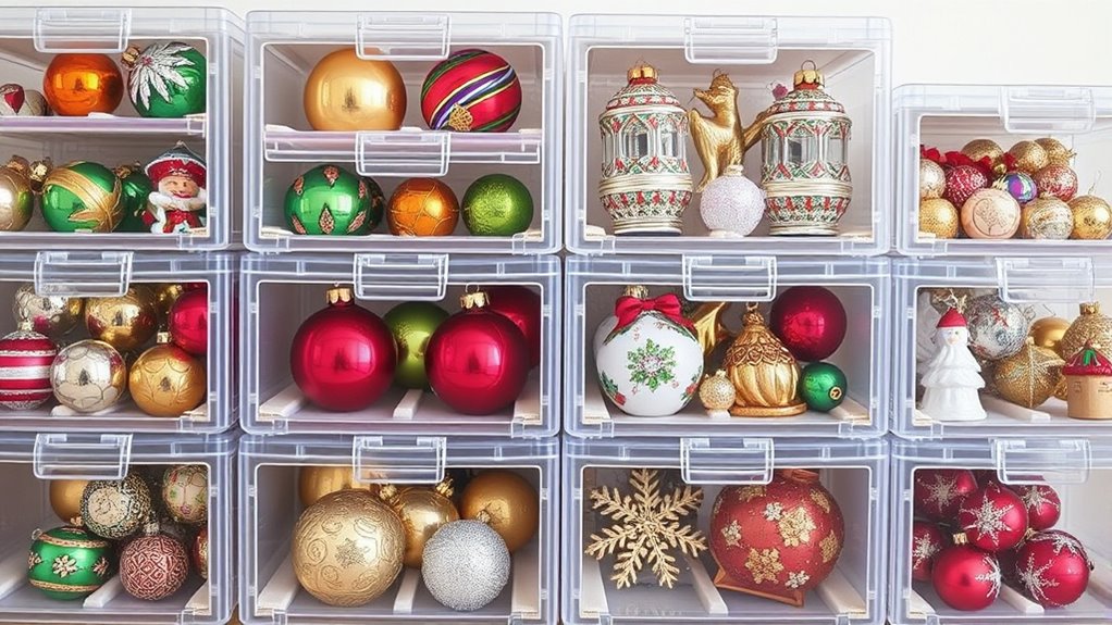Maximizing space when storing ornaments requires thoughtful design features that make the most of limited area. A space-optimized storage box often features vertical or stackable layouts, boosting capacity without taking up extra floor or shelf space. Adjustable dividers and removable trays allow me to customize compartments, fitting various ornament shapes and sizes easily. Collapsible or foldable structures are a game-changer—they let me store the container itself away when not in use, freeing up space. Multi-functional features like top compartments for larger decorations or external pockets for accessories further enhance storage efficiency. A well-designed box not only organizes ornaments to prevent damage but also reduces clutter, making access quick and simple. These features ensure I utilize every inch of available space effectively.