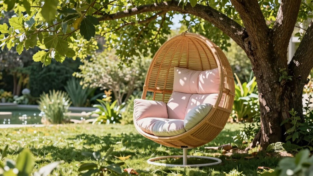 Maintaining the cleanliness and appearance of outdoor egg chair cushions is essential for preserving their comfort and longevity. I recommend spot cleaning with a damp cloth and mild detergent to keep cushions looking fresh. If your cushions have removable covers, wash them separately following the manufacturer’s instructions to extend their lifespan. When cushions arrive, they might need 48 hours of airing out or fluffing to regain their full loft. Choosing weather-resistant cushions with water-repellent fabrics can minimize cleaning caused by splashes or light rain. During heavy rain or extended non-use, store cushions in a dry, sheltered space to prevent mold and deterioration. Regular care guarantees your cushions stay comfortable, vibrant, and durable for years to come.