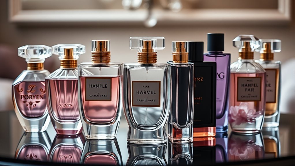 Since portability is essential for those who want to enjoy their favorite scents throughout the day, I pay close attention to perfume packaging. Compact, travel-sized bottles—like 20ml or 30ml—are perfect for on-the-go use, fitting easily into handbags or pockets. I look for sealed packaging with secure caps to prevent leaks and preserve the fragrance during travel. Lightweight, discreet bottles make it simple to carry and refresh my scent whenever needed without hassle. Refillable spray atomizers are also a great option for easy application and reducing breakage risks. Additionally, elegant and durable packaging not only looks appealing but also protects the perfume, ensuring it lasts longer and stays in perfect condition. Good packaging truly enhances the overall experience.