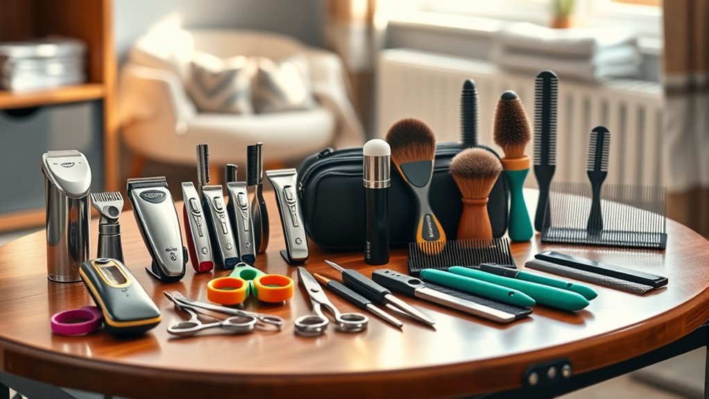 Have you considered how proper maintenance and the right accessories can extend the life and effectiveness of your pet grooming kit? Regularly cleaning blades with the included brush and oil keeps them sharp and prevents rust, guaranteeing ideal cutting performance. Many kits feature removable, washable blades or cutter heads, making cleanup easier and maintaining hygiene. Accessories like guide combs, scissors, and cleaning brushes add versatility and precision, helping you handle different coat types and styles. Proper storage, such as dedicated cases or organizational bags, keeps everything organized and protects your tools from damage. Additionally, replacing or upgrading blades and guard combs when needed ensures consistent grooming results and allows you to adapt to your pet’s changing coat needs. Proper maintenance truly maximizes your kit’s lifespan and performance.