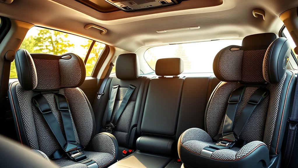 Imagine a chameleon blending seamlessly into different environments—that’s how premium all-in-one car seats work across various vehicles. They’re designed with adaptable features, like adjustable harnesses and multiple installation options, ensuring compatibility with most models. As a result, I find these seats incredibly versatile, fitting snugly and securely whether I’m in a compact car or a larger SUV. This flexibility offers peace of mind for safe, comfortable travel every time.