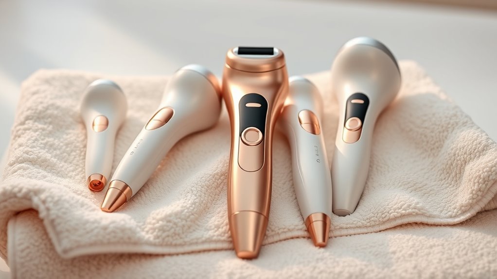 Selecting a premium anti-aging facial device requires careful consideration of your skin’s unique needs and safety features. First, check that the device suits your skin type—whether sensitive, oily, dry, or acne-prone—by reviewing manufacturer recommendations and user feedback. Safety features like automatic shutoff and sensors are essential to prevent overheating and skin damage. Adjustable intensity levels allow you to customize treatments to your comfort and tolerance. Ensure the device uses dermatologist-tested, non-irritating materials and LED wavelengths proven safe for prolonged skin exposure. Additionally, verify certifications such as FDA approval or CE marking, which confirm the device meets strict safety standards. Prioritizing these factors helps ensure your at-home treatments are both effective and safe.