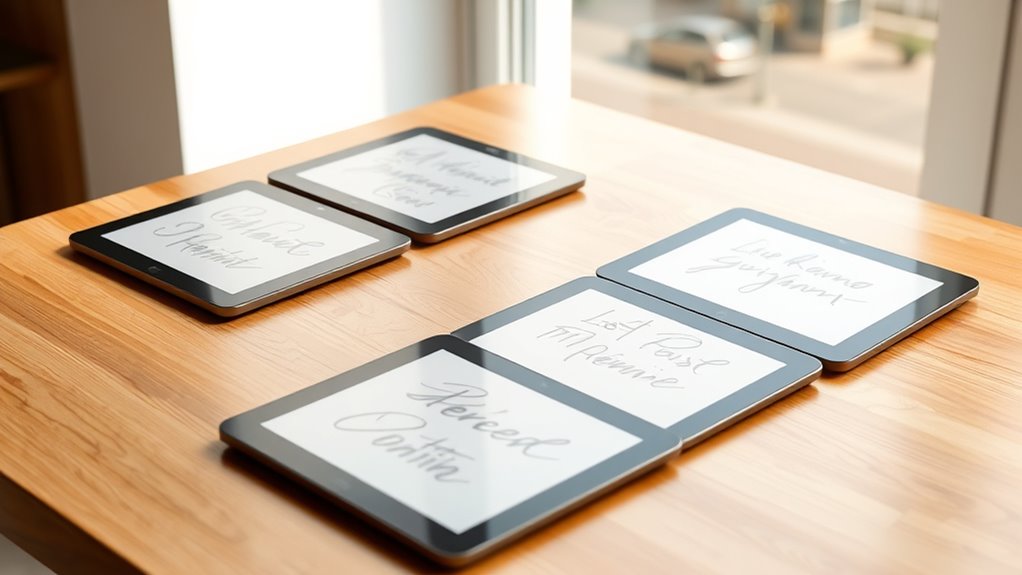 High stylus sensitivity and precise tip design are essential for a natural writing and drawing experience on premium E-Ink tablets. A stylus with 4096 levels of pressure sensitivity allows for nuanced control, making handwriting and sketches feel more realistic. Precise tip design, like fine tips or electromagnetic pens, enhances accuracy, especially for detailed notes or intricate illustrations. Low latency response times, ideally under 50 milliseconds, reduce lag, giving a seamless feel that closely mimics traditional pen-on-paper writing. Tilt support adds versatility, enabling shading and varied strokes that replicate real pencil techniques. Compatibility with different stylus types ensures flexibility, letting users select tools that suit their preferred style. Together, these features considerably improve the overall note-taking and creative experience on premium E-Ink tablets.