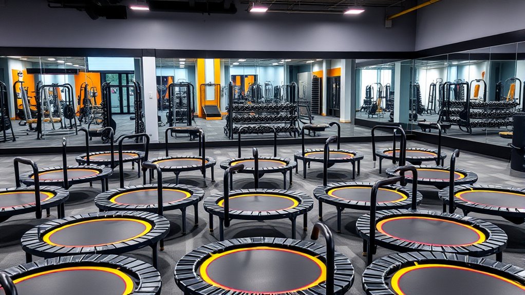 If you’re looking to upgrade your workout with the best premium fitness trampolines, I recommend checking out sets like JumpSport’s models, versatile rebounders with adjustable tension, and durable octagonal designs with handles. These options offer stability, high weight capacities, and safety features for low-impact cardio or rehab routines. Their durable frames and convenient sizes make them perfect for indoor or outdoor use. Stay with me to discover the top choices and how they can elevate your fitness game.