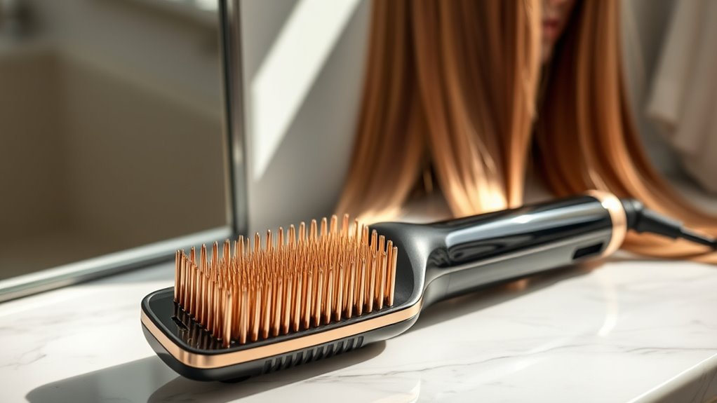 Choosing a premium hair straightening brush with precise heating technology is essential for achieving consistent results while minimizing damage. Advanced systems like T-sensors or MCH heating monitor and adjust the temperature every millisecond, ensuring even heat distribution throughout your styling. This consistency helps prevent hot spots that can damage hair. Adjustable temperature settings, typically from 170°F to 450°F, let you customize based on your hair type and styling needs. Rapid heat-up times, often within 15-30 seconds, mean less waiting and more efficiency. Technologies like dual ionic generators or nano ceramic coatings regulate heat to reduce frizz and damage. Plus, memory functions that recall your preferred heat settings maintain the same temperature throughout styling, ensuring reliable, salon-quality results every time.