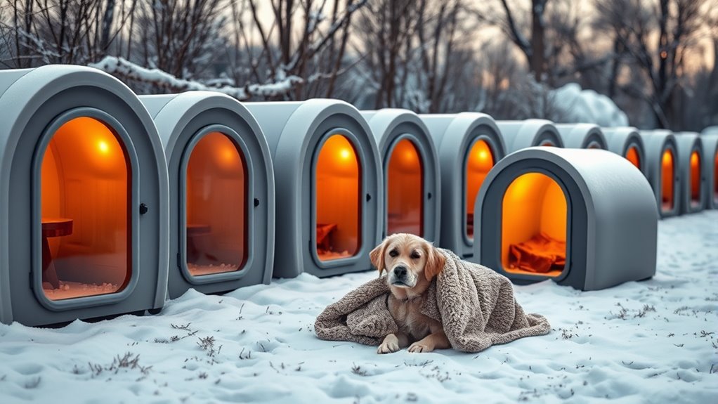 I can assure you, safety is a top priority. These pet houses feature automatic thermostats that monitor and manage temperature, preventing overheating. Some models include safety shut-off switches and insulation that evenly distributes heat, avoiding hot spots. Plus, many have venting systems to release excess heat and moisture. Rest assured, these thoughtful features keep your furry friends warm without risking their safety, giving you peace of mind.