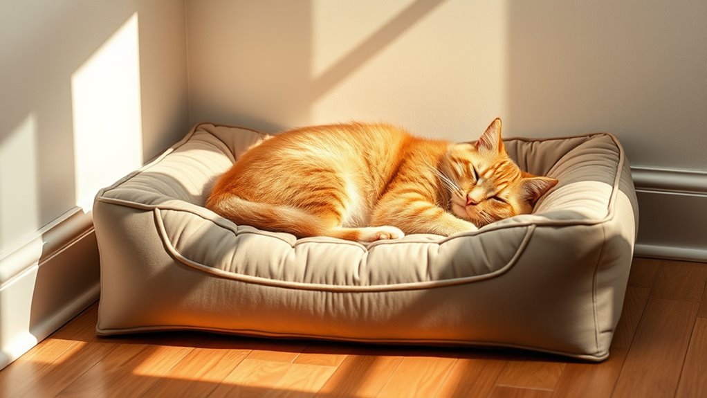 When selecting a heated cat bed for small cats, comfort and safety are top priorities. I recommend a cozy plush donut shape because it offers security and a perfect curling spot, ideal for small cats and kittens. Look for beds with adjustable temperature and timer settings to guarantee safe, consistent warmth. A thermostatically controlled heating pad keeps the bed from overheating and automatically cools when not in use. These beds work well year-round, providing warmth during cold days and cooling when needed. Easy to use and safe, they create a relaxing, secure environment that helps your small feline feel cozy and loved.