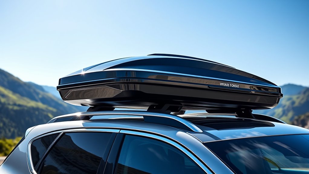 Choosing a premium roof cargo box that fits your vehicle isn’t just about size—it’s about guaranteeing compatibility with your roof rack system. First, I verify that the cargo box works with both factory-installed and aftermarket crossbars. I measure my roof dimensions and crossbar spacing to make sure the box fits without overhang or obstruction. It’s also essential to check my vehicle’s roof weight limit and the maximum capacity of my crossbars to avoid overloading. I look for mounting hardware and clamps that are adjustable or specifically designed for my roof rack’s style, whether round, square, or aerodynamic. Finally, I consider the opening mechanism to guarantee it’s practical for my vehicle’s design and easy to access during trips. This careful check guarantees a secure, compatible fit.
