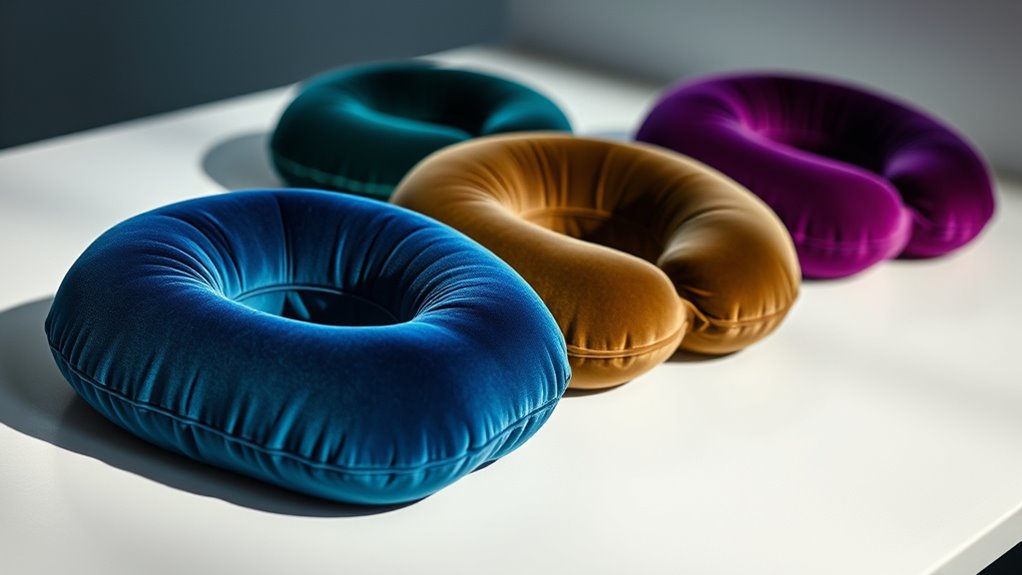 Ergonomic designs among top-tier travel pillows vary to prioritize neck support and comfort. Some feature contoured shapes that cradle your neck, while others use adjustable firmness or removable inserts for a personalized fit. I’ve found that the best ones balance firmness with softness, ensuring your head stays aligned without causing strain. These designs focus on reducing pressure points and promoting proper posture, making your travel experience much more comfortable.