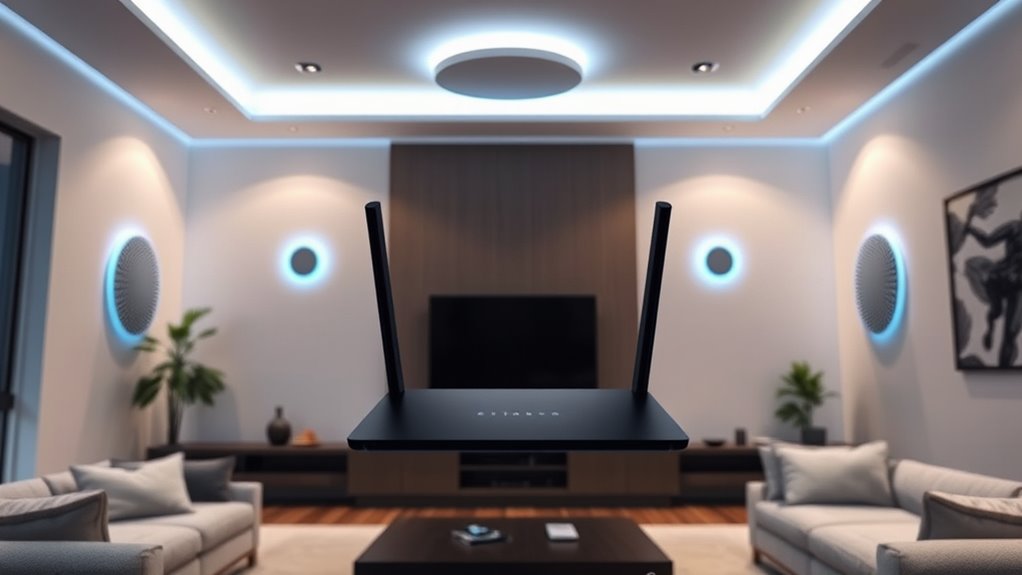 Choosing the right Wi-Fi technology standard is key to guaranteeing your mesh system delivers fast, reliable performance throughout your home. Standards like Wi-Fi 6, Wi-Fi 6E, and Wi-Fi 7 define the maximum speeds, frequency bands, and features supported. Wi-Fi 6 offers higher throughput, better device capacity, and improved performance in crowded environments. Wi-Fi 6E extends this into the 6 GHz band, providing extra channels, less interference, and faster speeds for compatible devices. Wi-Fi 7 takes it even further with multi-gigabit speeds, Multi-Link Operation, and 320 MHz channels, supporting demanding tasks like 8K streaming and gaming. Compatibility with these standards ensures your mesh system delivers future-proof, high-speed, low-latency connectivity across your smart home network.