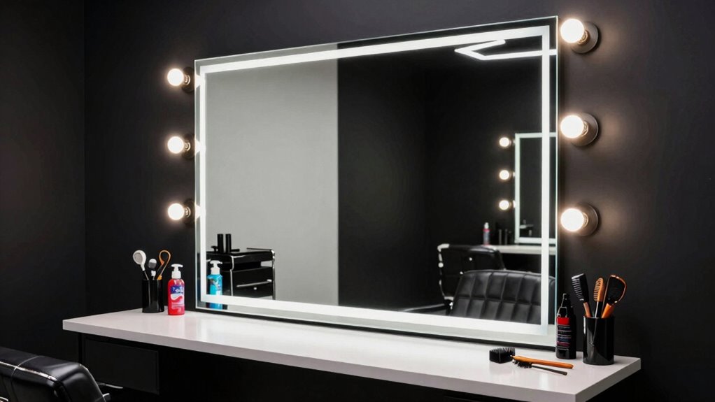 Lighting options play a vital role in how well I see my work in the mirror. Bright, even lighting reduces shadows and highlights details, making it easier to cut precisely. I prefer LED lights because they’re adjustable and give a natural daylight spectrum. Good lighting helps me catch every detail, ensuring a clean, professional cut. Without proper illumination, I risk uneven results and missed spots.