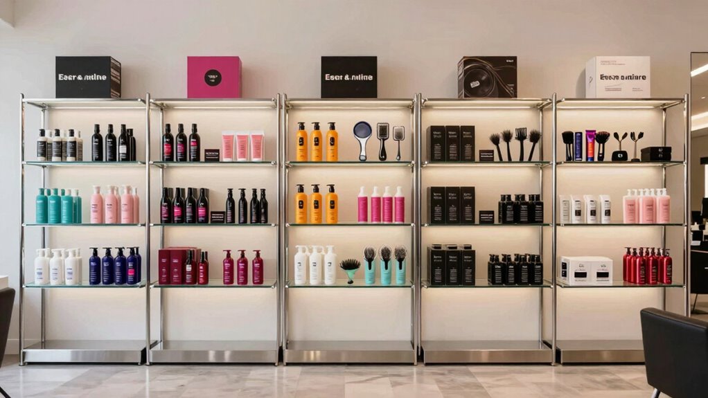 To guarantee your retail display shelving enhances your salon’s overall look, it’s essential to match its style with your existing decor. I consider whether your salon has a modern, industrial, or traditional vibe and choose a shelving style that complements it. Matching the color scheme of the unit with your decor helps create a cohesive, professional appearance. The material finish, like matte black, metallic, or wood grain, should align with your interior design theme. Additionally, the shelving design should reflect your brand’s personality—sleek and minimalist or ornate and decorative. Finally, I verify that the style integrates seamlessly with other retail fixtures and displays, ensuring a unified, polished look throughout your salon space.