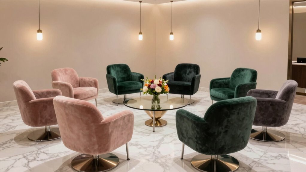 Choosing the right salon waiting room chairs hinges on their ability to support clients comfortably during potentially long waits. I look for chairs with supportive backrests that promote proper posture and reduce fatigue. Cushions filled with high-density foam or sponge are essential because they maintain their shape and provide lasting comfort. Padded armrests add extra support, helping clients relax more easily. I also consider contoured designs that fit the natural curves of the lumbar and back areas, which can prevent back pain. Adjustable features, like reclining or height options, are a bonus, as they accommodate different client needs and preferences. Ultimately, a chair that combines good support with comfort creates a welcoming, relaxing environment, making clients feel cared for even during extended waits.