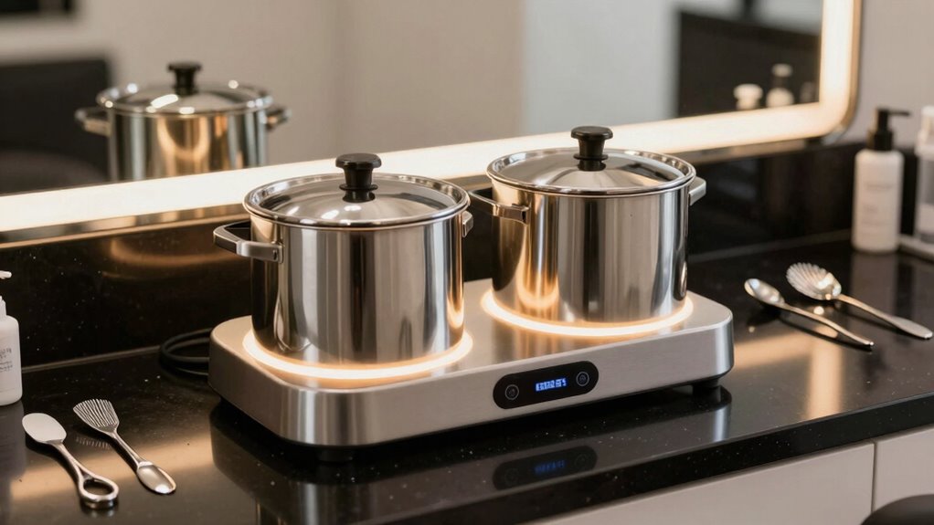 Safety and durability are top priorities when setting up a salon wax warmer station with double pots. I always look for models with overheating protection that automatically shut off or regulate temperature, preventing burns and equipment damage. It’s essential that the construction uses resilient, heat-resistant materials like stainless steel or high-quality aluminum, which can withstand frequent use. Secure, removable lids are a must—they prevent wax spills and protect staff from hot wax splashes. Stability matters too; I prefer warmers with non-slip rubber feet and heat sinks to dissipate heat efficiently, reducing slip risks and internal overheating. Finally, double pot designs with independent temperature controls and clear visibility help ensure safe, precise wax heating for multiple treatments, making the station both safe and efficient.
