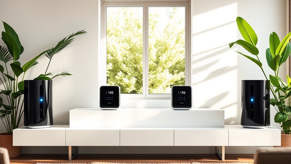 If you’re looking for the best smart air purifiers in 2025, I’ve got you covered. Top picks include models from LEVOIT, Blueair, and GoveeLife that combine advanced filtration with smart features like WiFi, voice control, and real-time air quality monitoring. These devices are perfect for large rooms, auto modes, and seamless integration with smart home systems. Want to discover which one suits your space best? Keep exploring to find all the details you need.