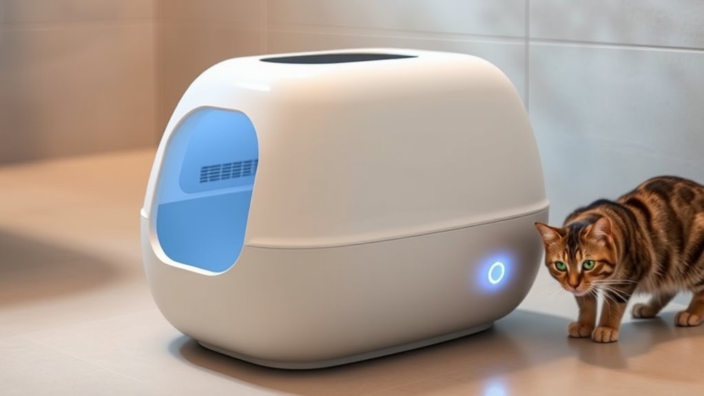 Imagine a sleek, futuristic pod that gently sifts through litter—yes, smart litter boxes are generally suitable for most cat sizes and breeds. I’ve found that many come with adjustable settings, making them adaptable for tiny kittens or larger, more robust cats. However, it’s always wise to verify the manufacturer’s recommendations, especially for extra-large or special-needs cats, to guarantee comfort and proper fit for your furry friend.