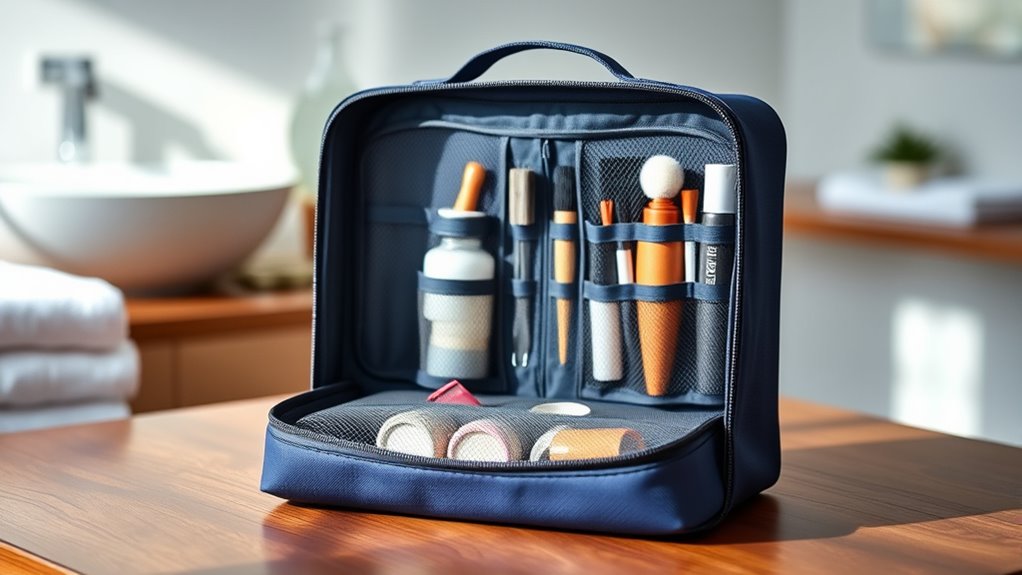 Ever wondered how to find your favorite toiletries quickly during travel? The key is choosing organizers with great visibility. Transparent or semi-transparent compartments let you spot items instantly without rummaging. Multiple zippered pockets and clear sections make accessing specific products easy and efficient, saving you time. Look for designs with visible elastic straps and mesh pockets to keep items upright and within reach. Clear interior layouts help during security checks, so you can verify contents at a glance and streamline TSA screening. These visibility-focused features not only make packing and unpacking smoother but also help you stay organized on the go. When you can see everything at once, it’s easier to maintain order and avoid unnecessary delays during your travels.