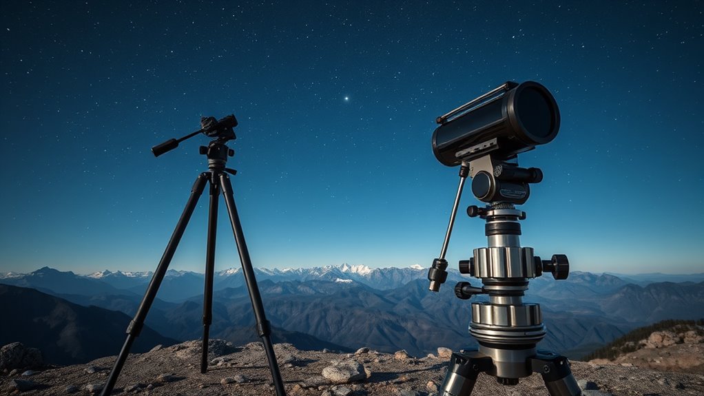 Achieving sharp astrophotography images depends heavily on stability and vibration control, as even the slightest shake can blur long-exposure shots. A stable tripod or pier mount minimizes vibrations, which is essential for clear, detailed images. The material and construction quality, like steel or aluminum with reinforced joints, play a critical role in damping vibrations effectively. Tripods with adjustable legs and locking mechanisms help maintain stability on uneven terrain, preventing unwanted movement. Adding weight or counterbalances can further lower the center of gravity, boosting steadiness. Properly designed mounts with rigid connections and minimal flexure are indispensable to prevent subtle movements that cause image blurring during long exposures. Prioritizing these factors ensures your setup remains stable, producing crisp, professional astrophotography results.