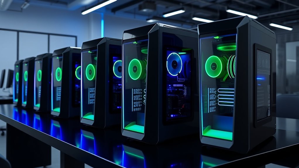 If you’re looking for the best VR-ready desk PCs of 2025, I’ve found top options with powerful processors like Intel i7 and i9, paired with high-end graphics such as NVIDIA RTX 5070 and 5060 Ti. These systems boast ample memory, fast SSDs, and sleek designs perfect for immersive virtual experiences. Whether you want budget-friendly or high-end setups, I’ll guide you through the most reliable choices to enhance your VR adventures, so stay tuned to learn more.