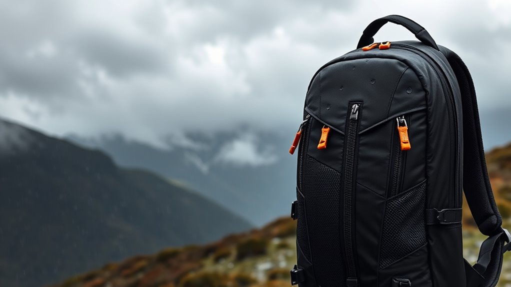 Weather-sealed backpacks are designed to handle extreme temperatures by using durable, insulating materials that protect your gear from heat and cold. I’ve found they often feature sealed seams and weather-resistant zippers that prevent moisture and wind from reaching your equipment, even in harsh conditions. While they help maintain a stable internal temperature, I still recommend avoiding prolonged exposure to extreme heat or cold to make certain your gear stays safe.