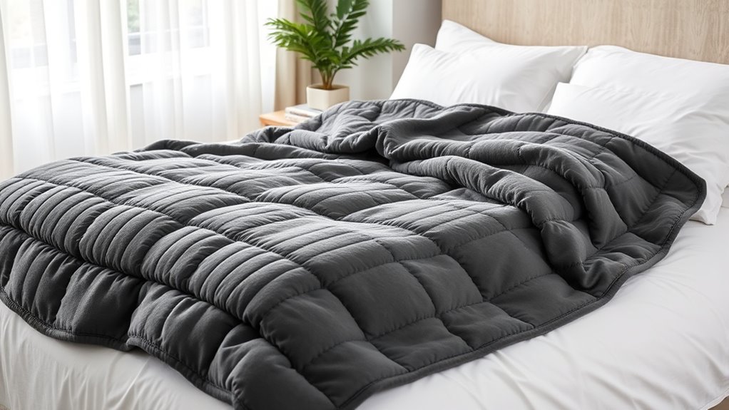 Selecting a weighted blanket that feels comfortable requires paying close attention to the fabric. I look for fabrics that are soft, breathable, and gentle on my skin, like cotton, fleece, or microfiber, to guarantee all-night comfort. Plush textures such as Sherpa or velvety fabrics add coziness and help reduce irritation, making the blanket more soothing. Breathable materials with moisture-wicking properties are essential to prevent overheating and sweating, which can interfere with relaxation. The material should also evenly distribute weight, preventing discomfort and ensuring effective pressure therapy. High-quality fabrics with dense stitching and secure bead compartments minimize noise and shifting, creating a calm, undisturbed experience. Choosing the right material ultimately enhances comfort and supports anxiety relief during use.