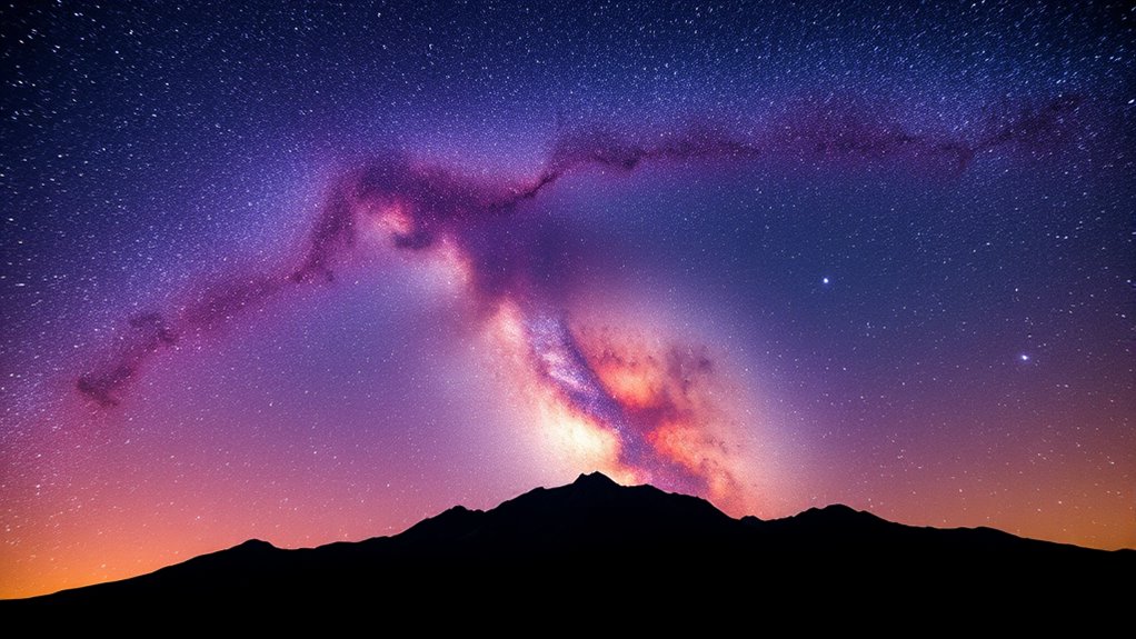 Ever wondered why aperture size plays such a crucial role in Milky Way photography? It’s because a larger aperture, like f/2.8 or wider, lets in more light, which is essential for capturing the faint stars and details of the Milky Way in low-light conditions. An ultra-wide aperture, such as f/1.4 to f/2.8, results in brighter images and shorter exposure times, helping to reduce star trails caused by Earth’s rotation. It also creates a shallower depth of field, adding a pleasing background blur that enhances the shot’s drama. Plus, larger apertures lower the need for high ISO settings, decreasing digital noise and improving overall clarity. However, ultra-wide apertures demand precise focusing and may introduce optical aberrations, which need careful consideration for sharp, stunning Milky Way images.